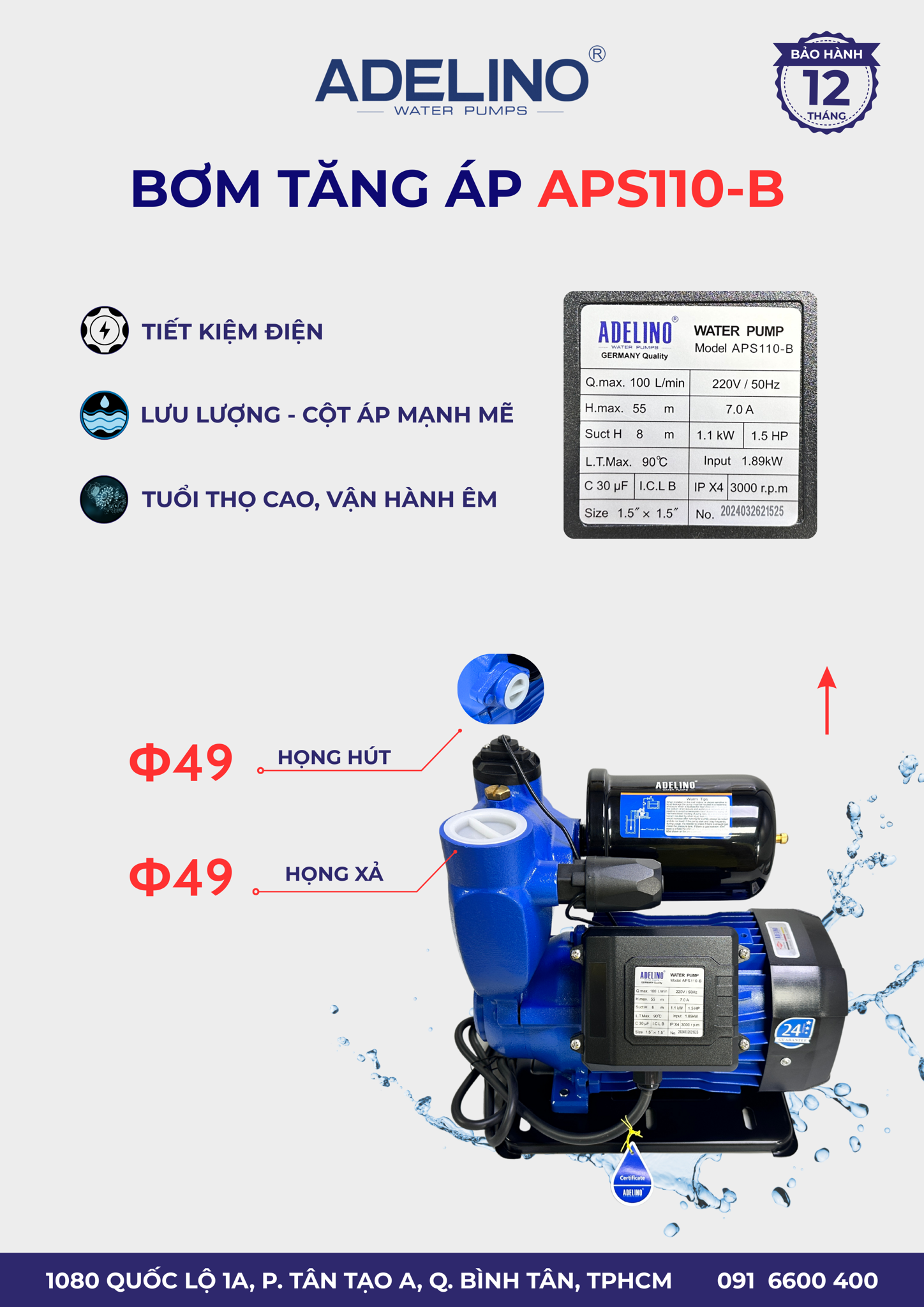 Máy bơm nước tăng áp mang thương hiệu ADELINO của Đức, dòng bơm thuộc tập đoàn đa quốc gia Wita. Đây là dòng máy bơm tăng áp tự động thông minh với chức năng hoạt động là máy tự bơm khi mực nước cần sử dụng giảm xuống mức tối thiểu và tự ngắt khi mực nước được bơm đầy đủ. Đồng thời, bơm tăng áp 1.1KW ADELINO còn được trang bị role cảm biến nhiệt có thể tự động ngắt máy khi nhiệt độ máy tăng vượt mức cho phép. Máy có thể gia tăng áp lực nước trong đường ống nơi có áp lực yếu một cách tự động.